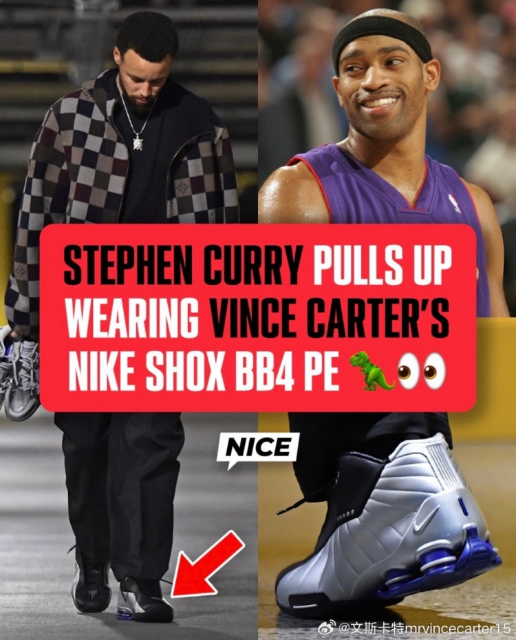 在赛前,库里穿着了和猛龙名宿文斯·卡特带火的球鞋Nike Shox BB4。